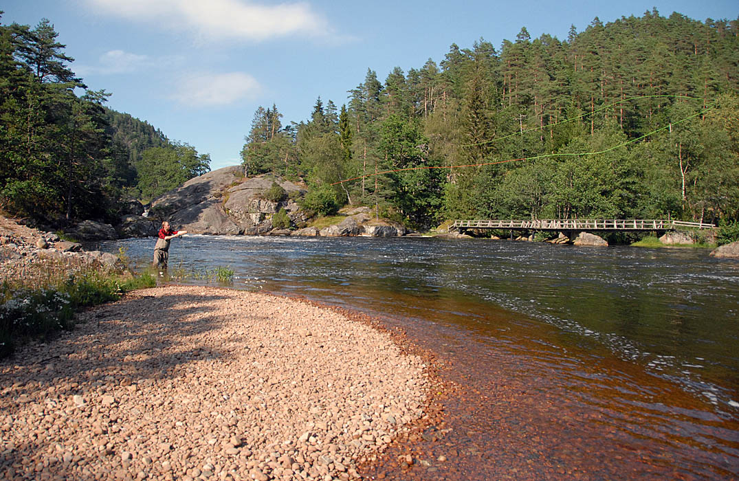 Vestbredden: Begge sider av Gislefosshølen er fiskbare med flue. Kenneth kaster langt med 11,6 switch.
