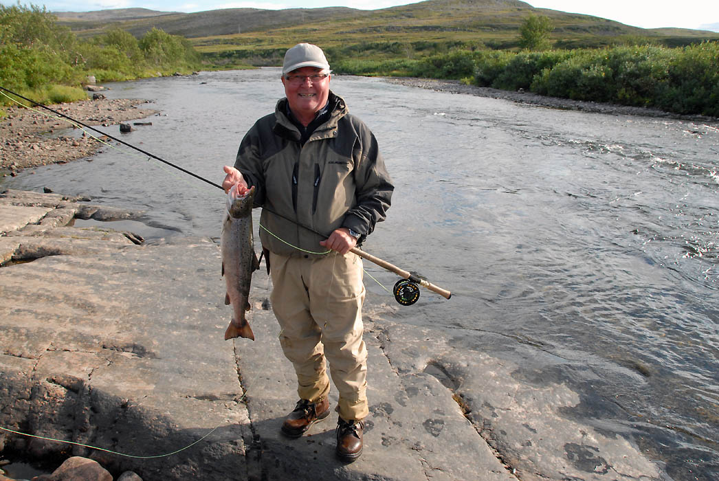 Per har landet en smålaks på våtflue ved "Svaberget". Blid gutt.