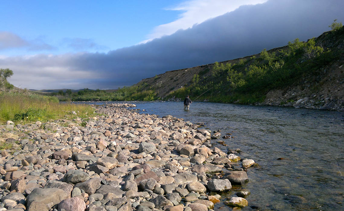 Vardøværing fisker i Sandmelen. Han har tatt med seg den lokale teknikken fra Komagelva.