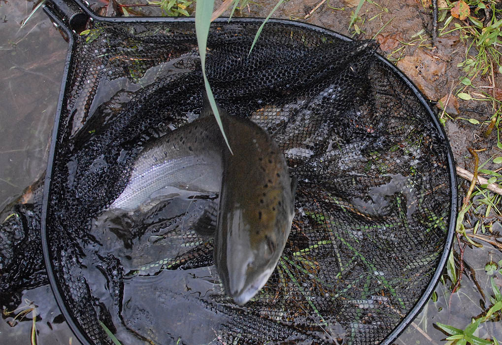 Smålaksen på 1,3 kilo skulle ut igjen etter fotografering, men gjenutsatte seg selv med dette sprellet.