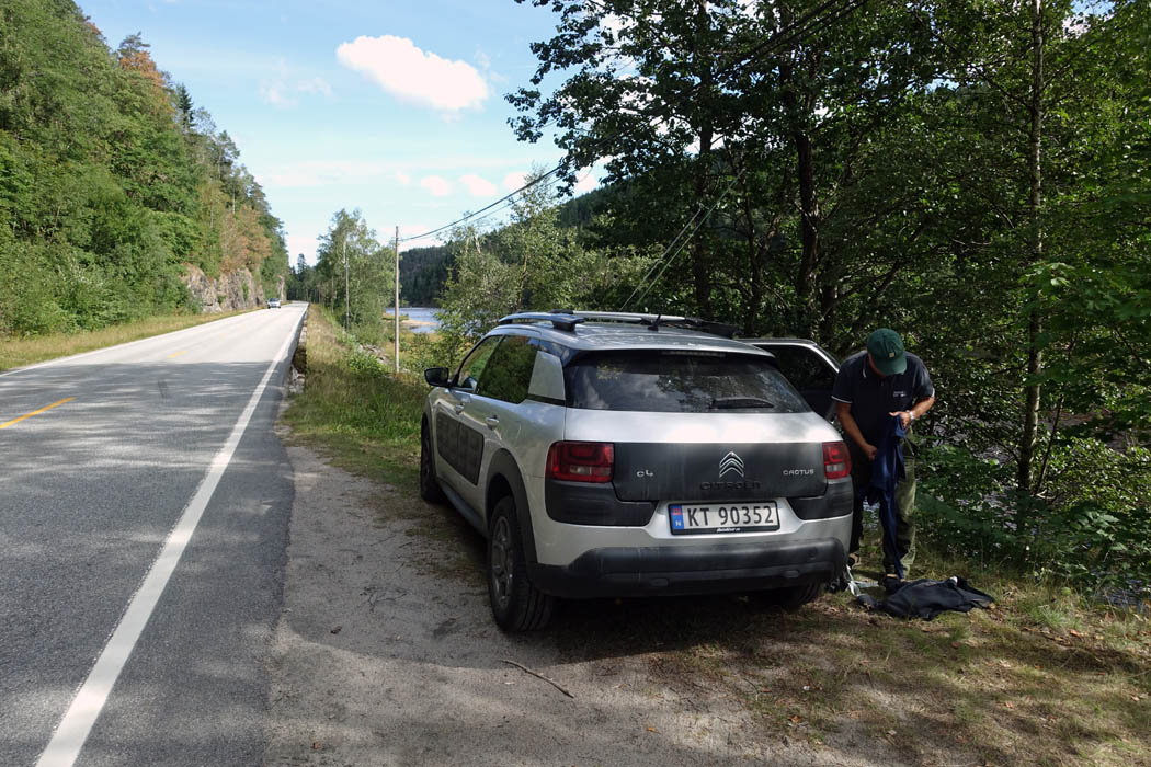 Parkeringsplassen er ikke all verden, men det er plass til en Citroen mellom veien og elva.