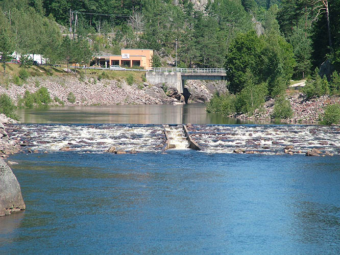Marnar Laksesenter i Laudal. Slike terskler er nå fjernet, og det naturlige elveløpet restaurert.