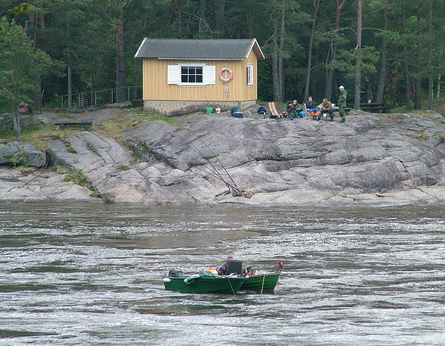 I båt eller på land - fisket ved Holmsfoss bedrives for det meste sittende.