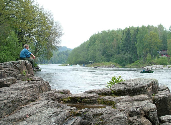 En tilskuer har tatt plass ved hølen under Holmsfoss. Det kan bli lenge å vente...