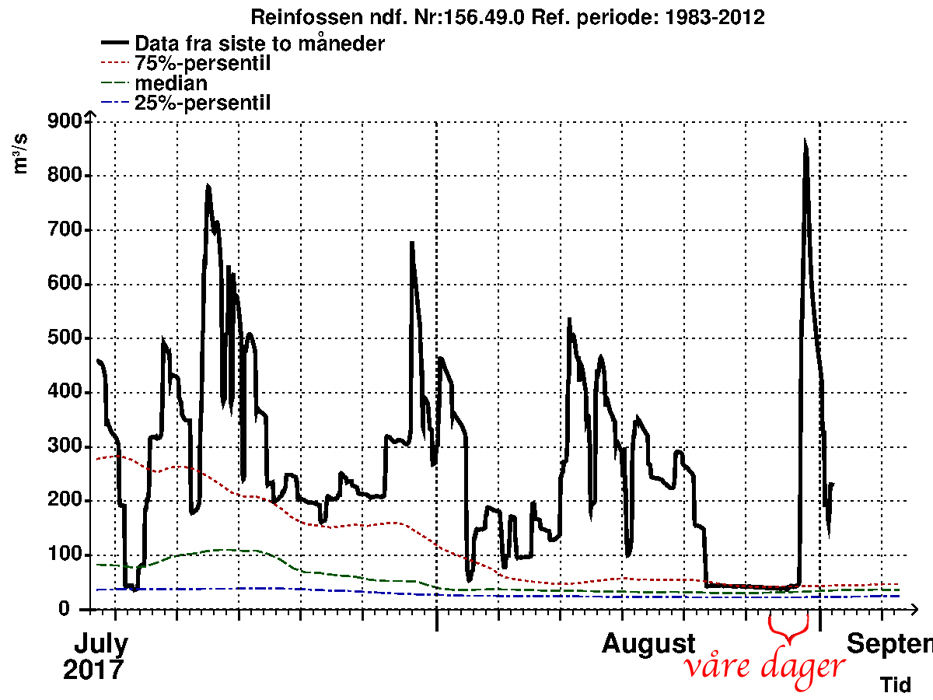 Vannføringen i Ranaelva kan være høyst variabel. Siste døgnet steg den fra ca. 40 til 850 m3/sek på 10 timer!