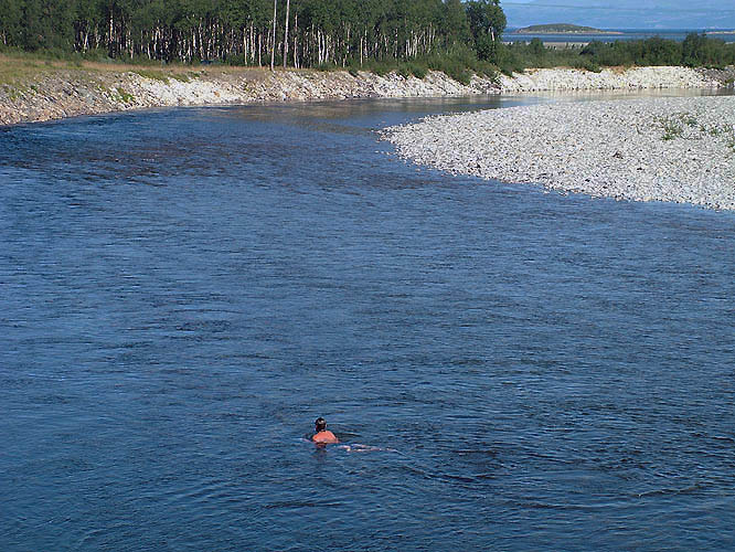 August 2004: 18 grader i vannet gjør Stabburselva mer egnet for bading enn for laksefiske.