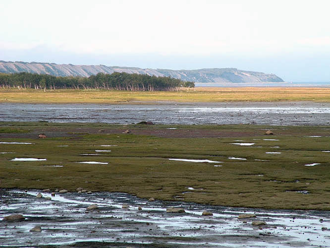 Porsangerfjorden ved lavvann. Bak neset renner Stabburselva ut.