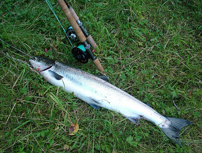 Sølvblank og sprek mellomlaks (4,4 kg), tatt på Berge.