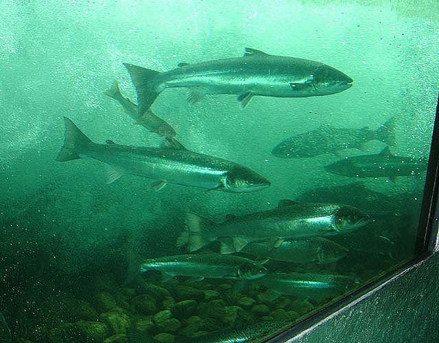 Fisken i "akvariet" står og venter på å bli sluppet videre opp gjennom trappa.