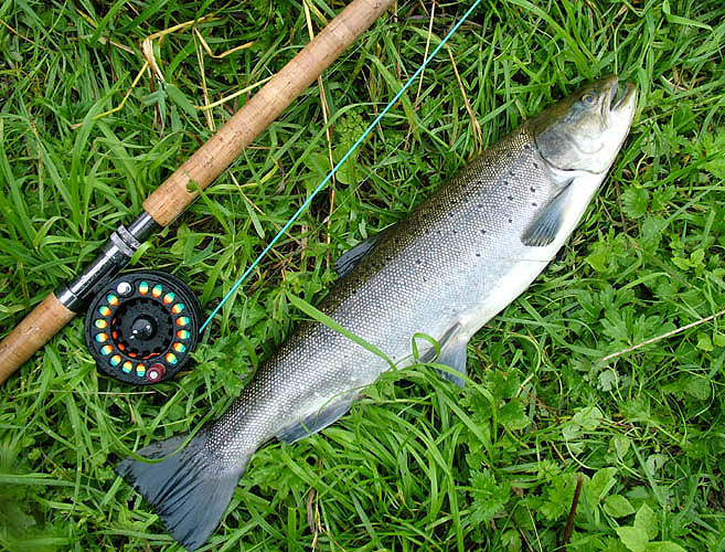 Trygt på land, og sannelig var det en ørret som hadde tatt flua midt på dagen!