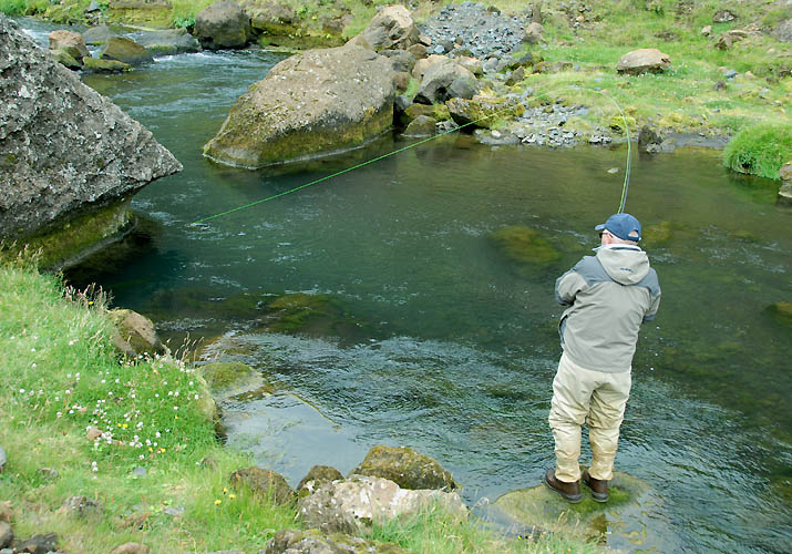 Per har vadet over for å komme i bedre posisjon for kjøring, men kan ikke hindre laksen i å