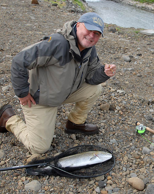 Stor: Vekta i håvskaftet viser 3,3 kg, og Per Bomann-Larsen feirer ørret-persen med sigar.